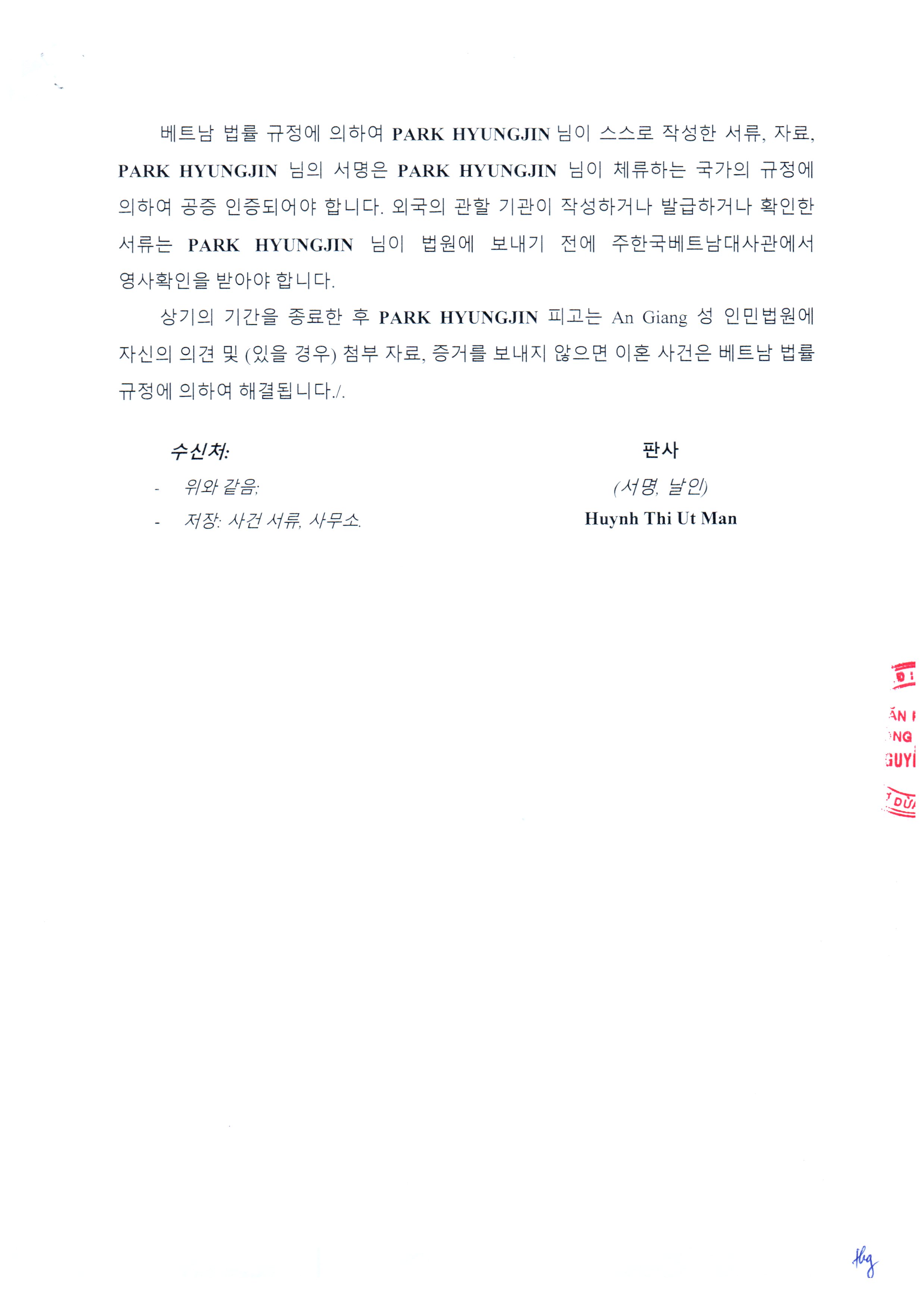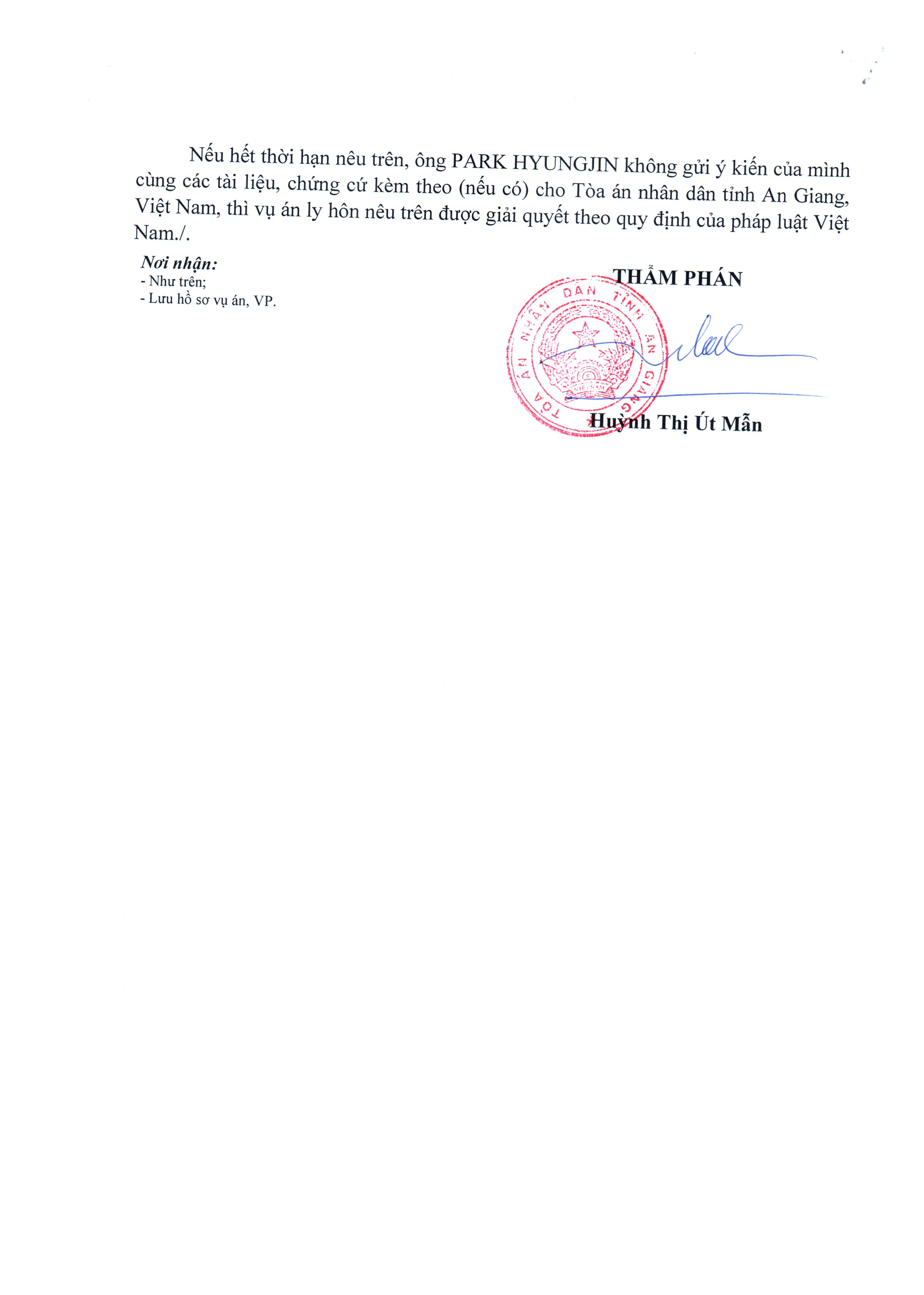 Tòa án Nhân dân tỉnh An Giang giải quyết ly hôn giữa bà Nguyễn Thị Hồng Gấm và ông Park Changkee
