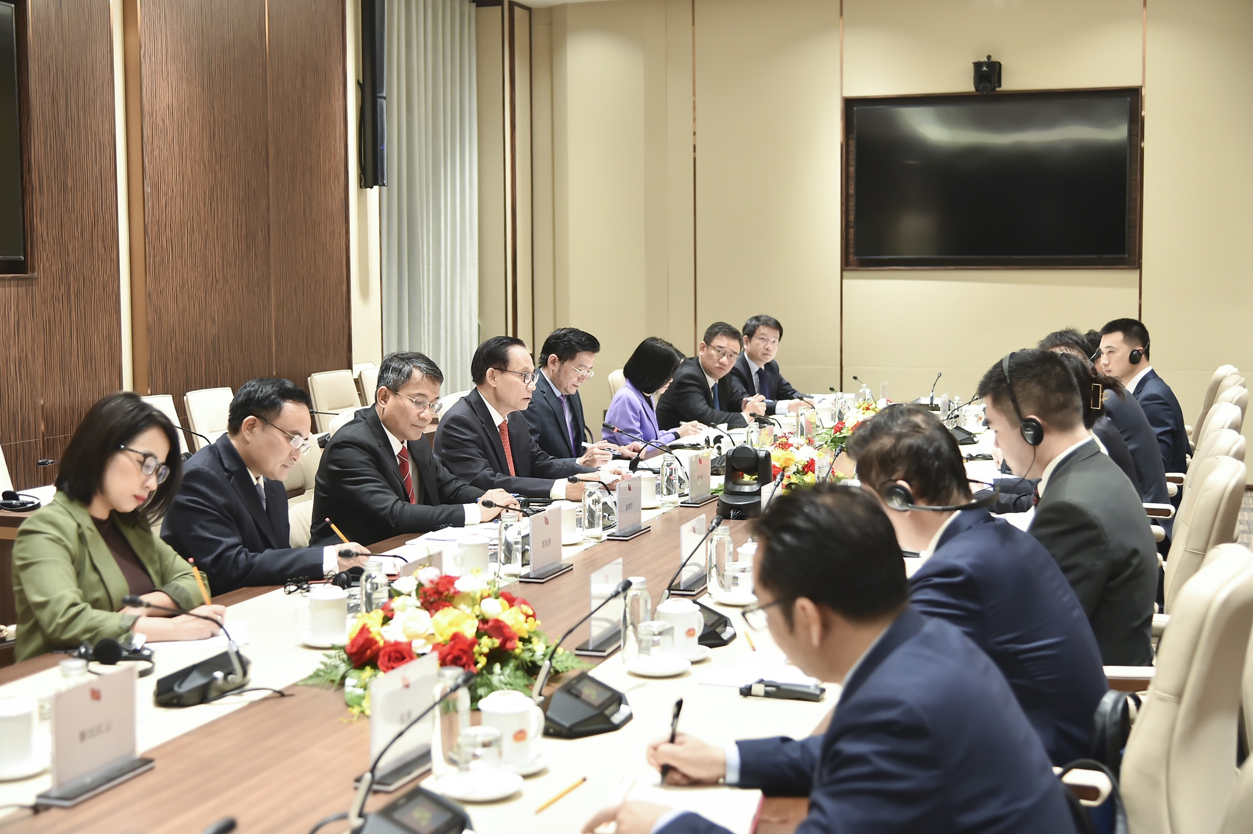 Chân thành cảm ơn những lời chúc mừng tốt đẹp của đồng chí Lưu Hải Tinh, Bộ trưởng Ngoại giao Lê Hoài Trung giới thiệu tổng thể về kết quả Đại hội toàn quốc lần thứ XIV của Đảng Cộng sản Việt Nam; Đại hội không chỉ đề ra mục tiêu, định hướng nhiệm vụ cho nhiệm kỳ 2026 - 2030 mà còn quyết định những vấn đề mang tầm chiến lược đối với tương lai và vận mệnh của dân tộc Việt Nam trong kỷ nguyên phát triển mới. Đồng chí Lê Hoài Trung thông tin về những điểm mới mang tính đột phá, sáng tạo của văn kiện Đại hội XIV, thể hiện bước phát triển sâu sắc, toàn diện về tư duy lý luận, đường lối lãnh đạo của Đảng Cộng sản Việt Nam cũng như sự thống nhất ý chí của toàn Đảng và nhân dân Việt Nam. Ủy viên Bộ Chính trị, Bộ trưởng Lê Hoài Trung nhấn mạnh Đại hội đã lần đầu tiên xác định đối ngoại, hội nhập quốc tế cùng với tăng cường quốc phòng, an ninh là nhiệm vụ trọng yếu, thường xuyên; khẳng định Việt Nam thực hiện nhất quán đường lối đối ngoại độc lập, tự chủ, tự cường, hòa bình, hữu nghị, hợp tác và phát triển, đa phương hoá, đa dạng hoá quan hệ đối ngoại, tham gia chủ động, có trách nhiệm vào việc giải quyết các vấn đề chung của khu vực và quốc tế.